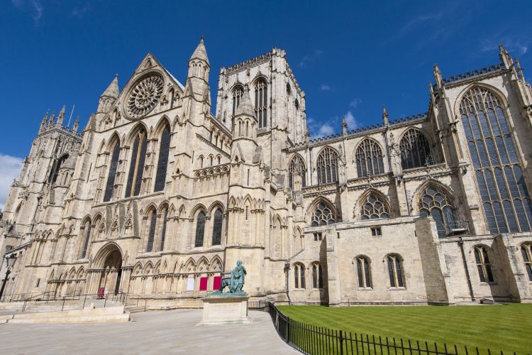 【约克大教堂】外观,这是欧洲现存至大的中世纪时期哥特式教堂之一,体现了精湛的设计和建筑艺术,十分的宏伟庄严,耗费了200多年的时间才建成,其中的中央大厅呈中轴对称法,是电影《哈利波特》中的霍格沃茨大厅拍摄地。