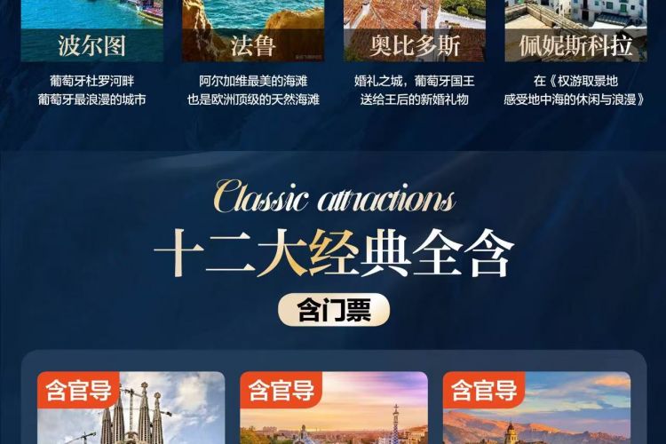 5.门票:龙达官导、塞戈维亚官导、阿尔罕布拉宫(含官导)、桂尔公园(含官导)、圣家族大教堂(含官导)、马德里皇宫(含官导)、圣本笃车站、莱罗书店、里斯本电车、佛朗明哥舞蹈表演、巴塞罗那港口游船;详细参照附带行程中所列之景点(其他为免费对外开放或外观景点或另付费项目);