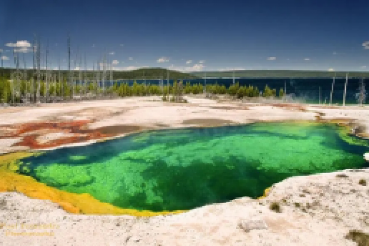【西拇指间歇泉】,五万年前因地壳陷落而形成,在热喷泉与湖水结合下,出现了一种烟雾弥漫的奇妙景观:烟雾缭绕处是热泉的蒸气,绿波盈盈处是黄石的湖水,与背景中蓝天白云相互辉映,形成与黄石其他温泉区不同的景观。